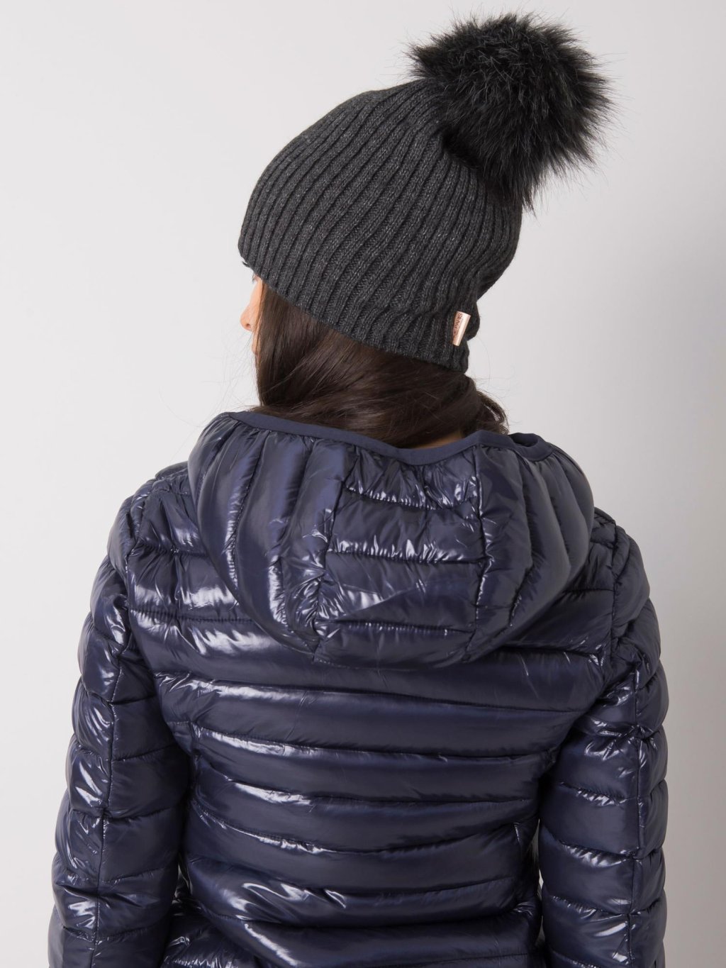 Tmavě šedá čepice s chlupatou bambulí