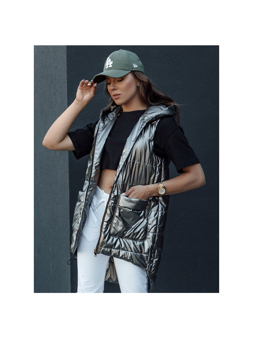 Tmavě šedá lesklá dámská vesta s kapucí JESS