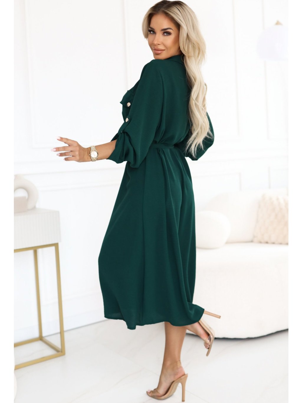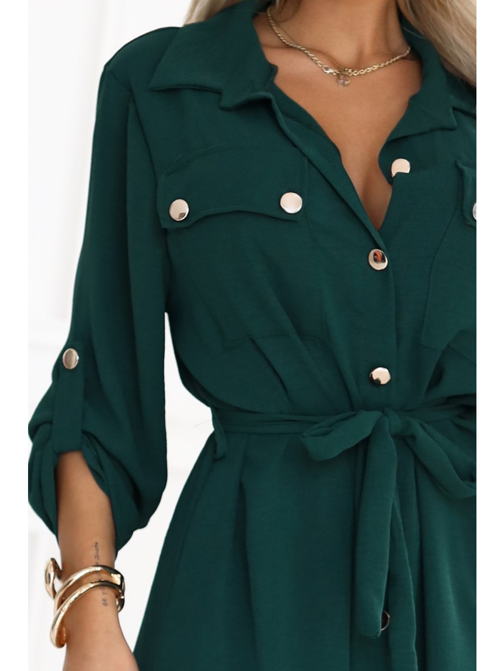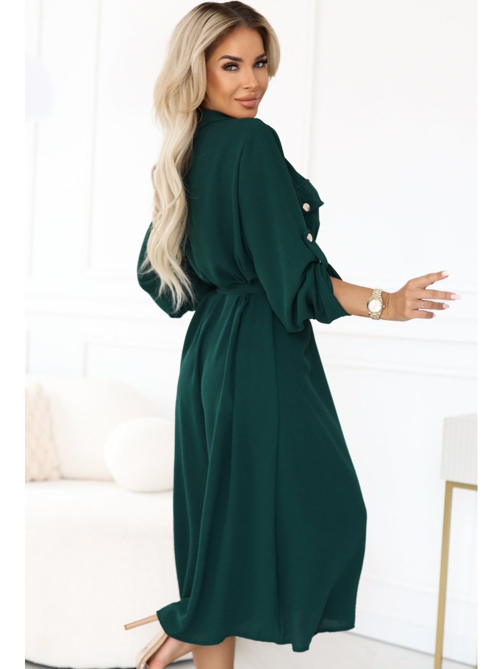 Tmavě zelené košilové midi šaty s vázáním v pase