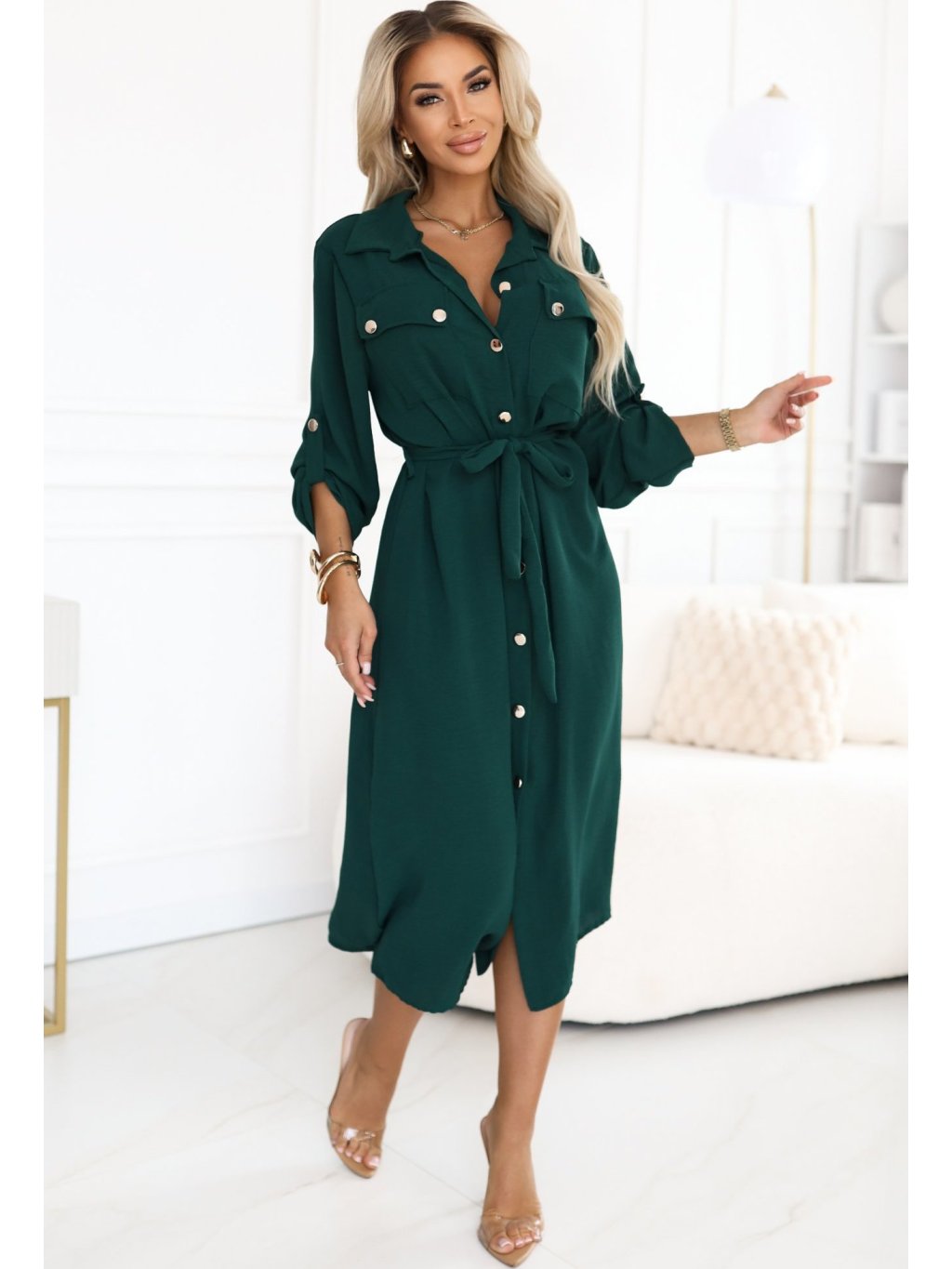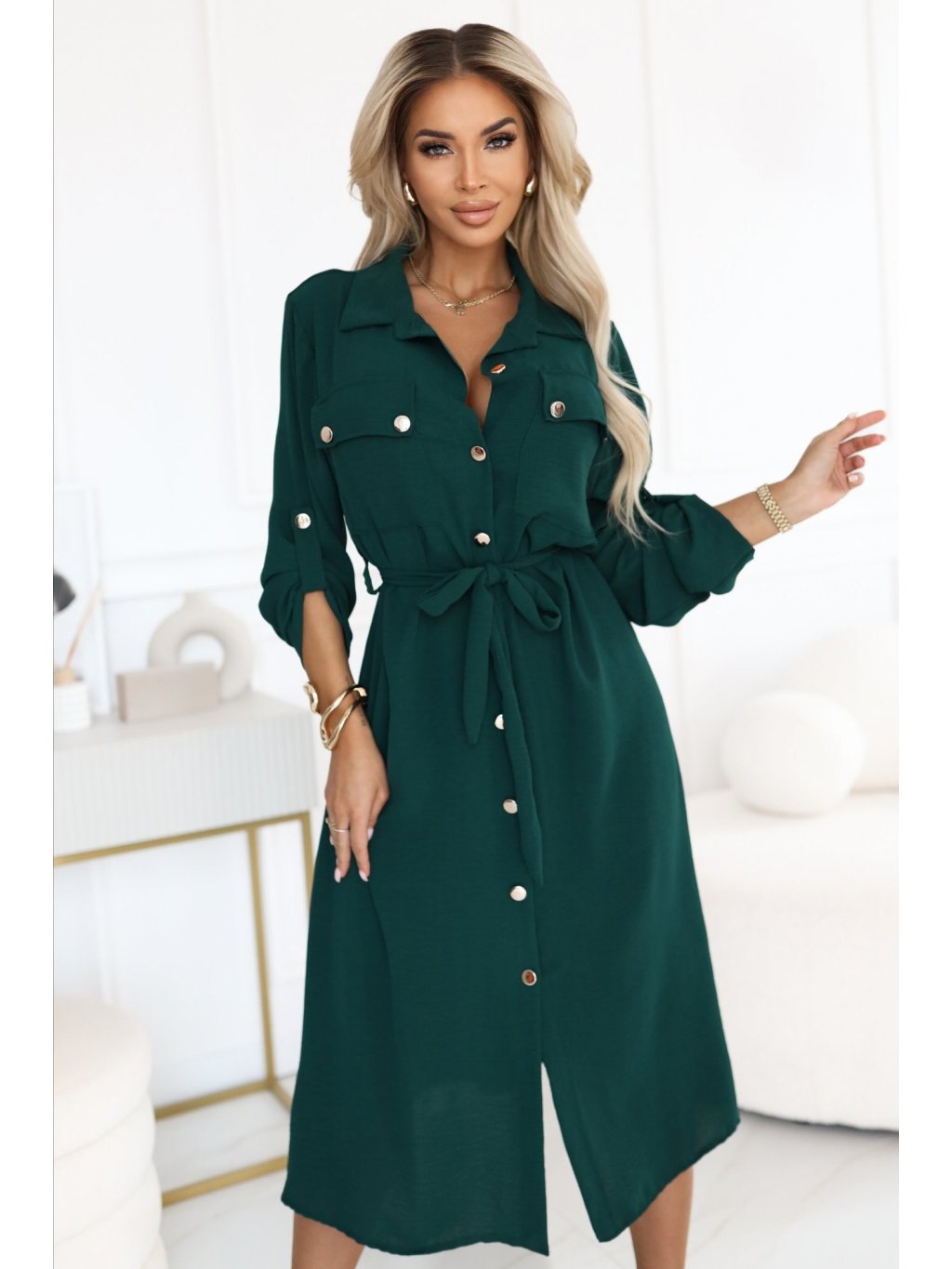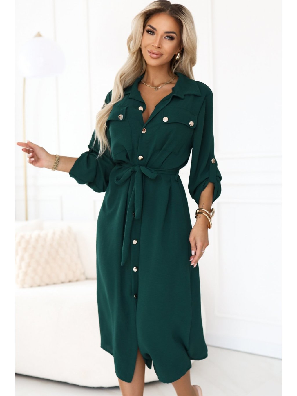Tmavě zelené košilové midi šaty s vázáním v pase