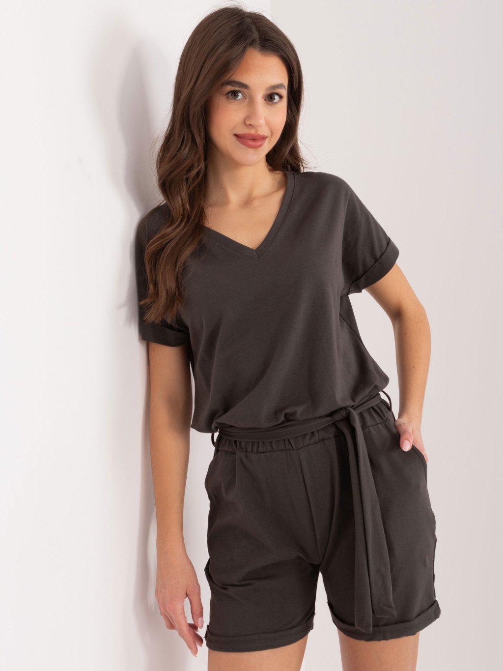 Tmavý khaki kraťasový overal s páskem