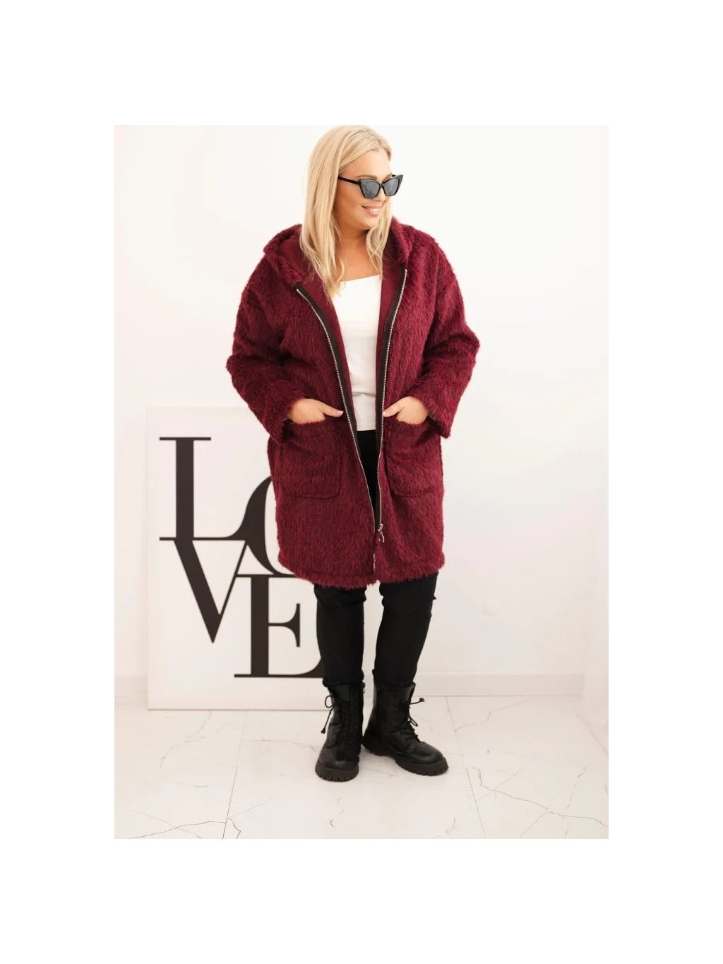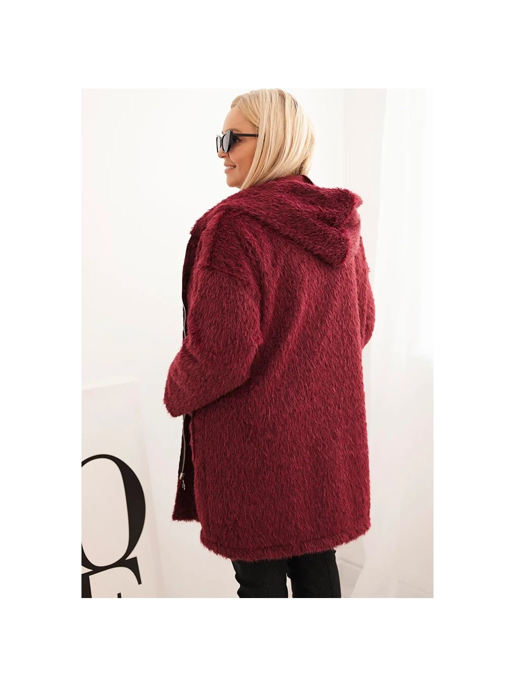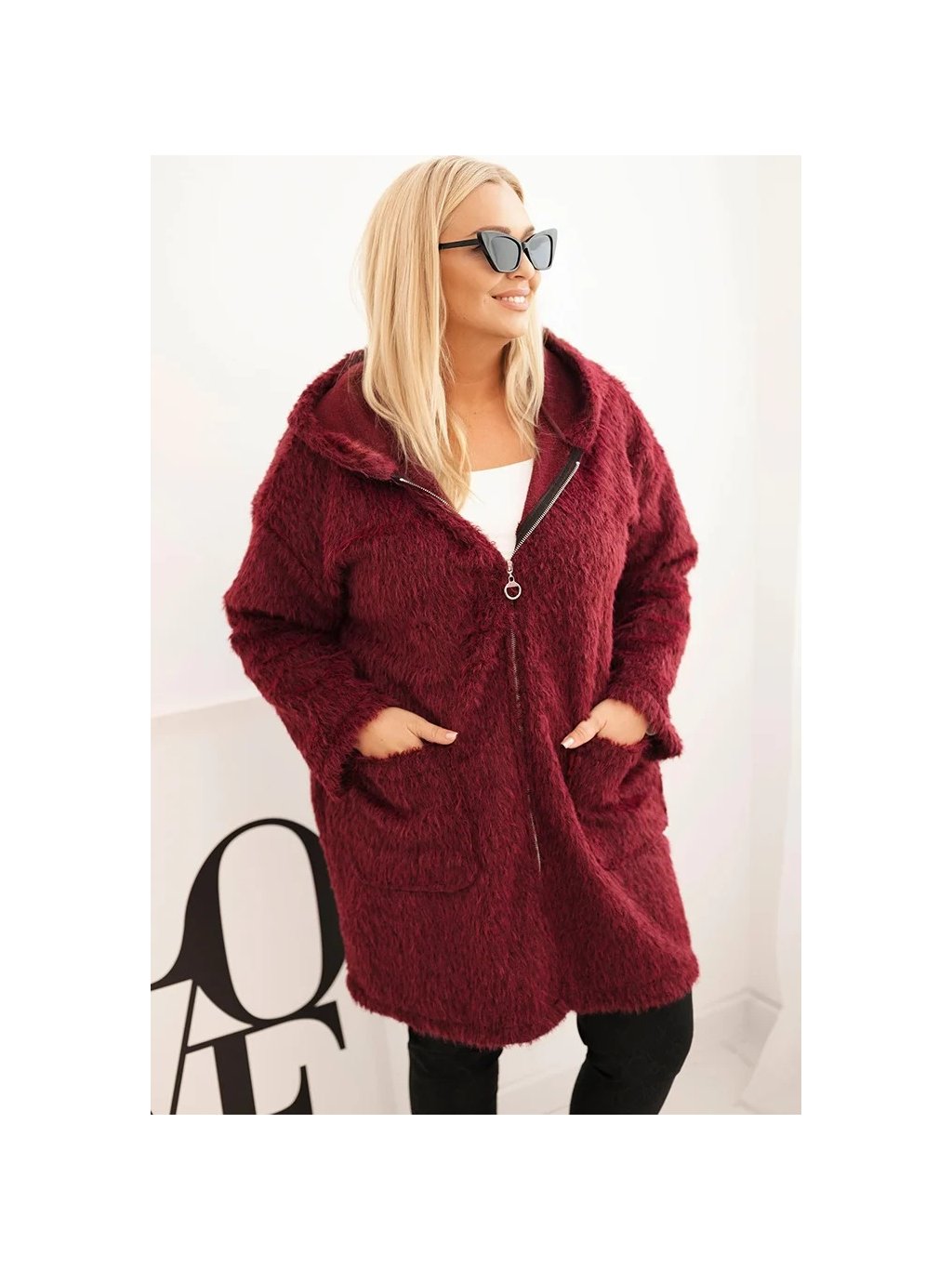 Vínový dámský viskózový Plus Size kabát na zip s kapucí