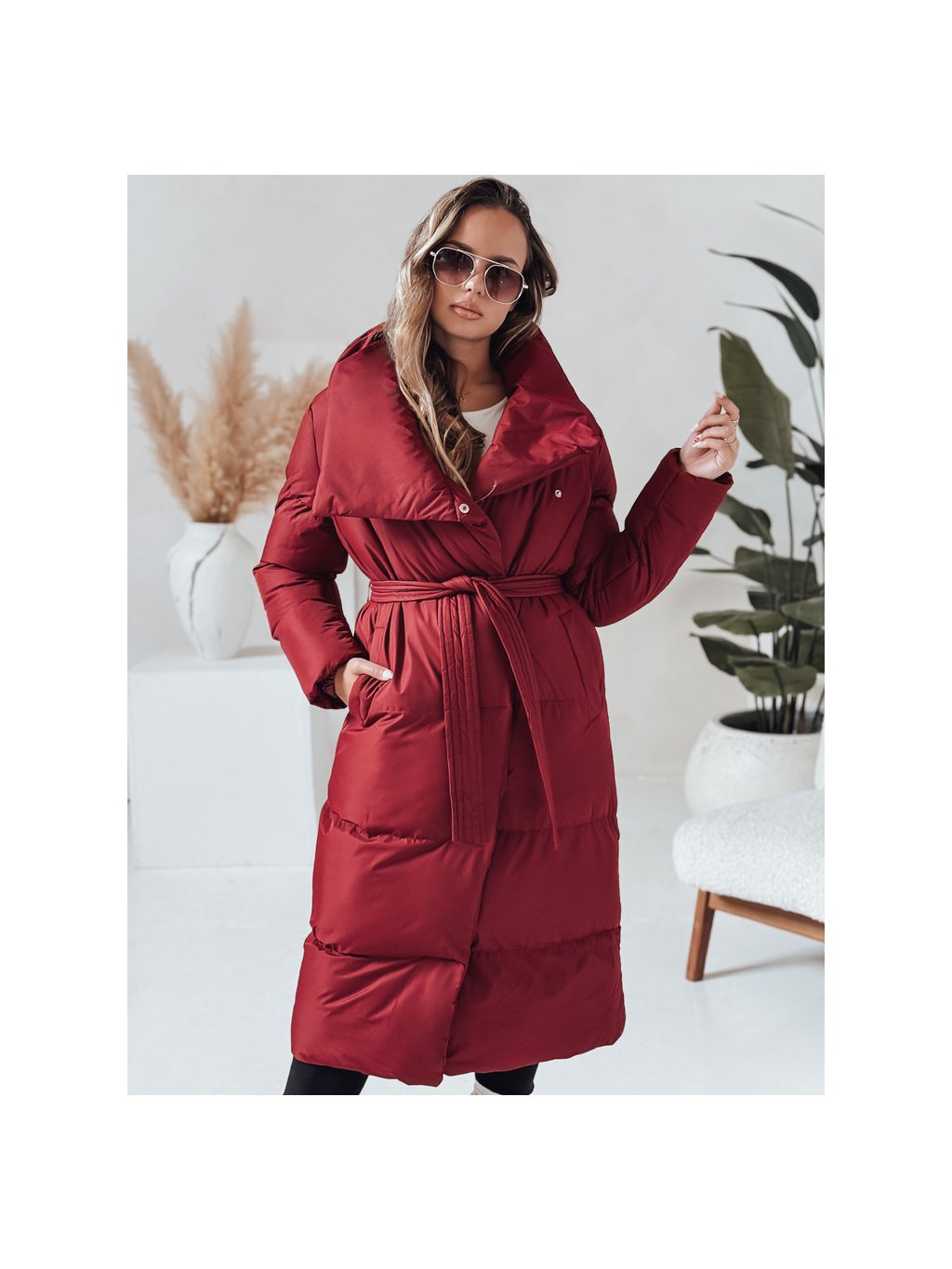 Vínový dlouhý dámský prošívaný kabát s páskem FAVI